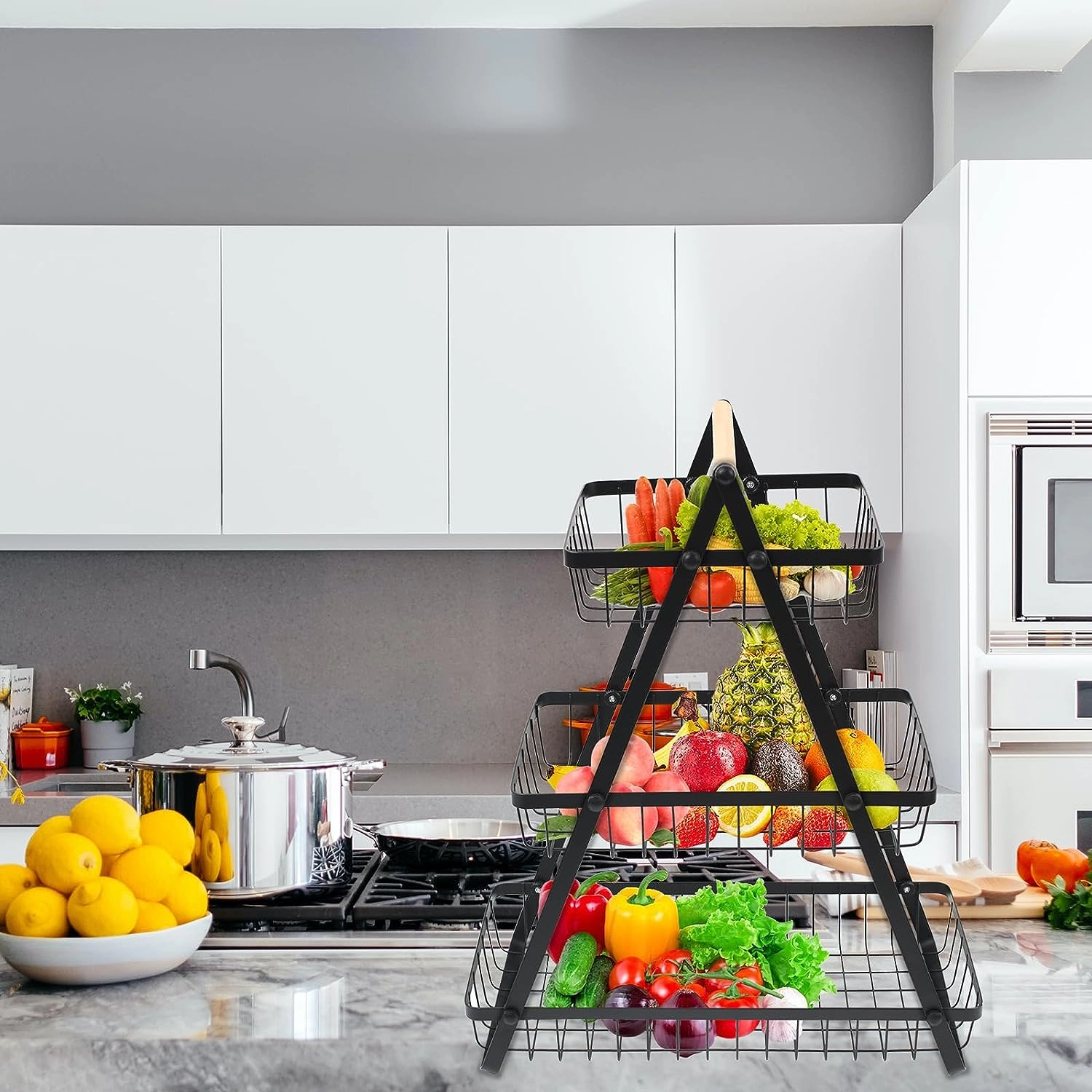Detachable 3-Tier Fruit Basket: It can hold plenty of various sized fruits, vegetables and bread, keeping your space neat, tidy and organized.